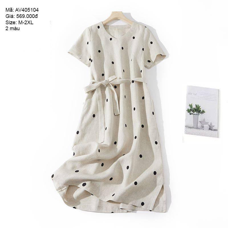 Đầm liền cổ tròn chấm bi ngắn tay thắt eo - AV405104
