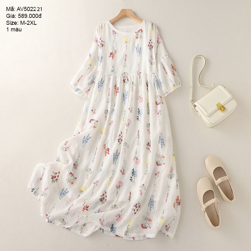 Đầm liền cổ tròn ngắn tay họa tiết hoa lá - AV502221