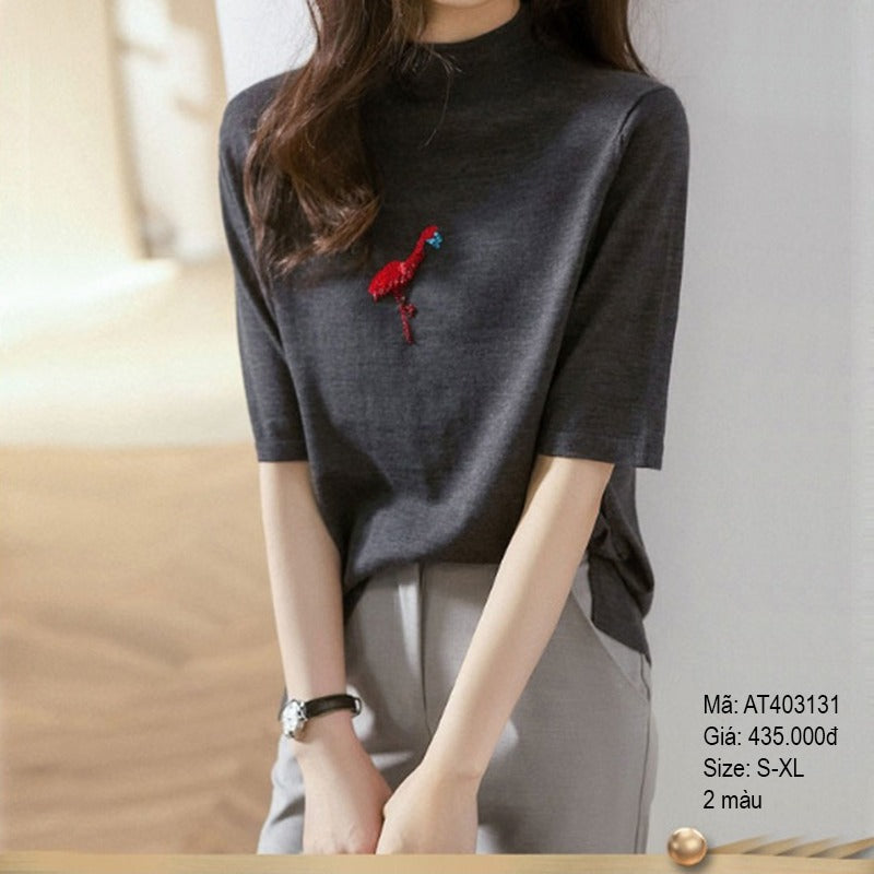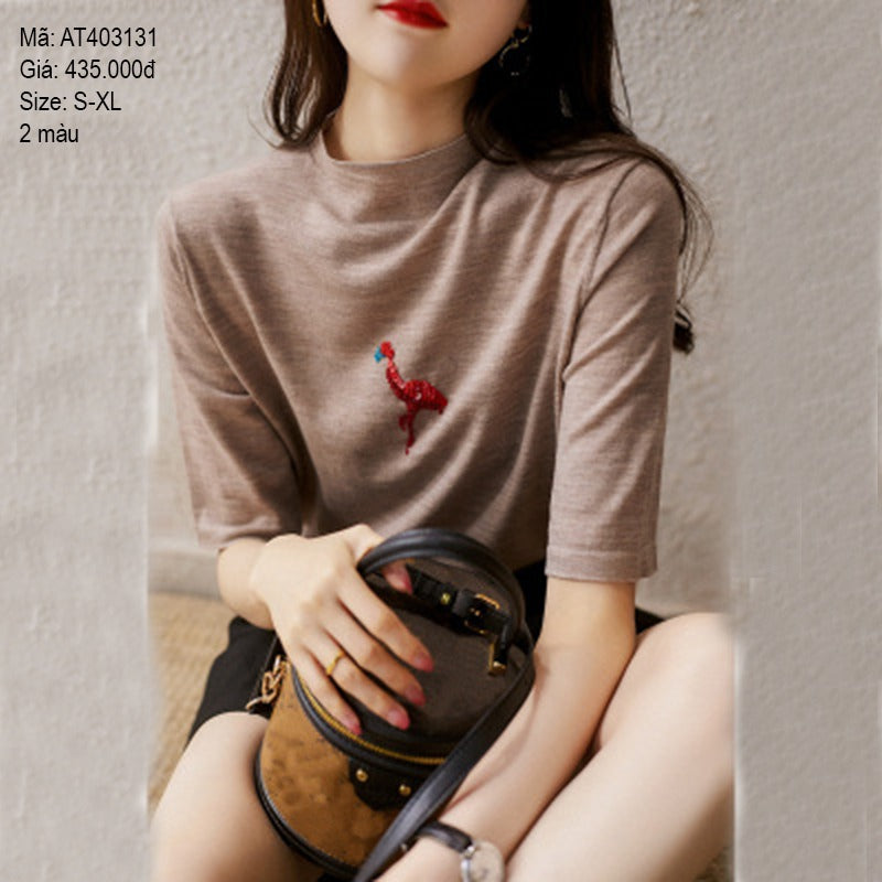- Áo thun ngắn tay cổ tròn thêu hồng hạc - AT403131