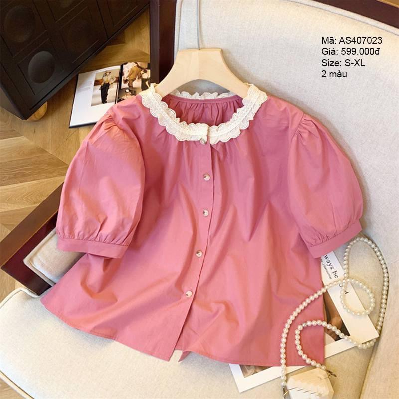 - Áo sơ mi cổ tròn đính ren ngắn tay form suông - AS407023