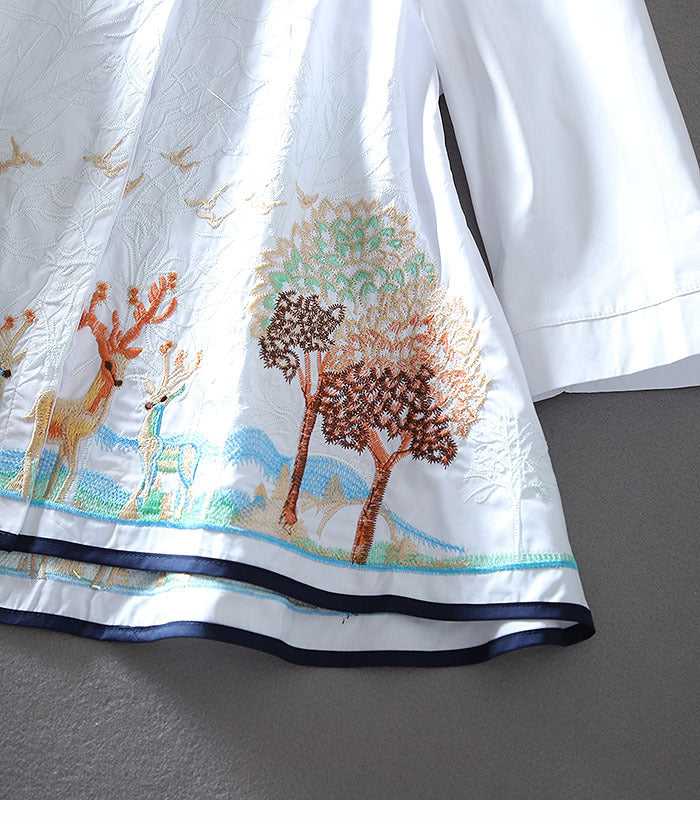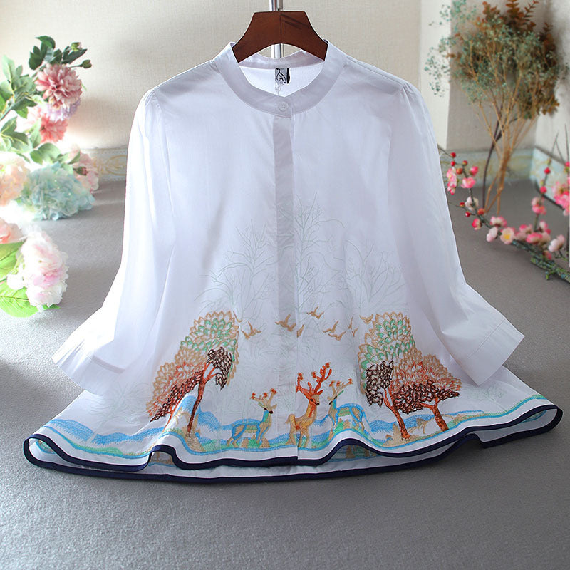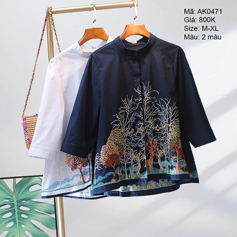 Áo sơ mi cổ tròn thêu hưu tay lửng - AK0471