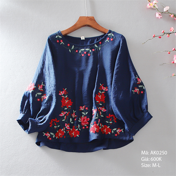 Áo sơ mi cổ tròn thêu hoa tay bồng - AK0250