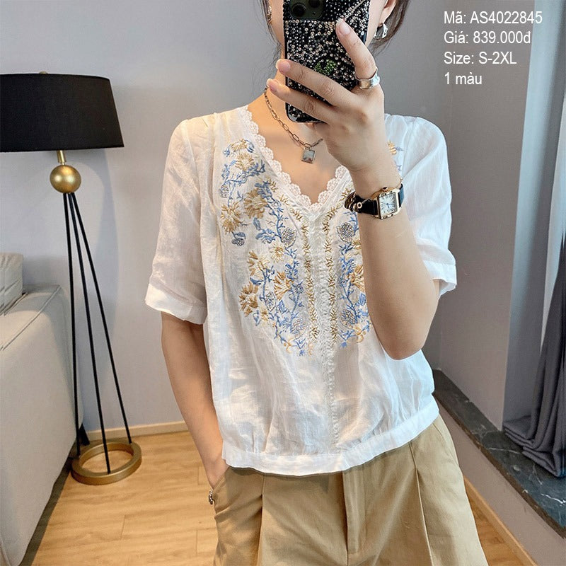 - Áo sơ mi cổ V ngắn tay thêu hoa đối xứng - AS402285