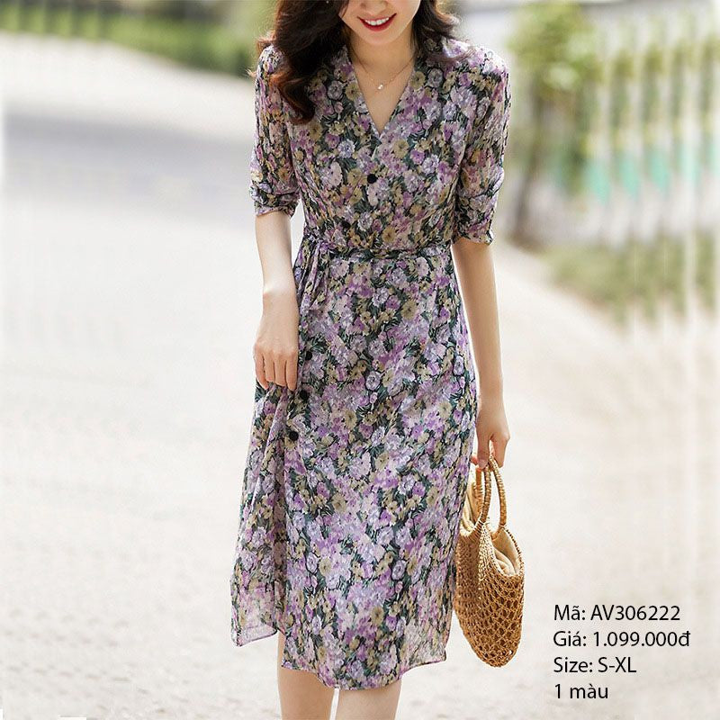 Đầm liền cổ tim tay lửng hoa tím thắt eo - AV306222