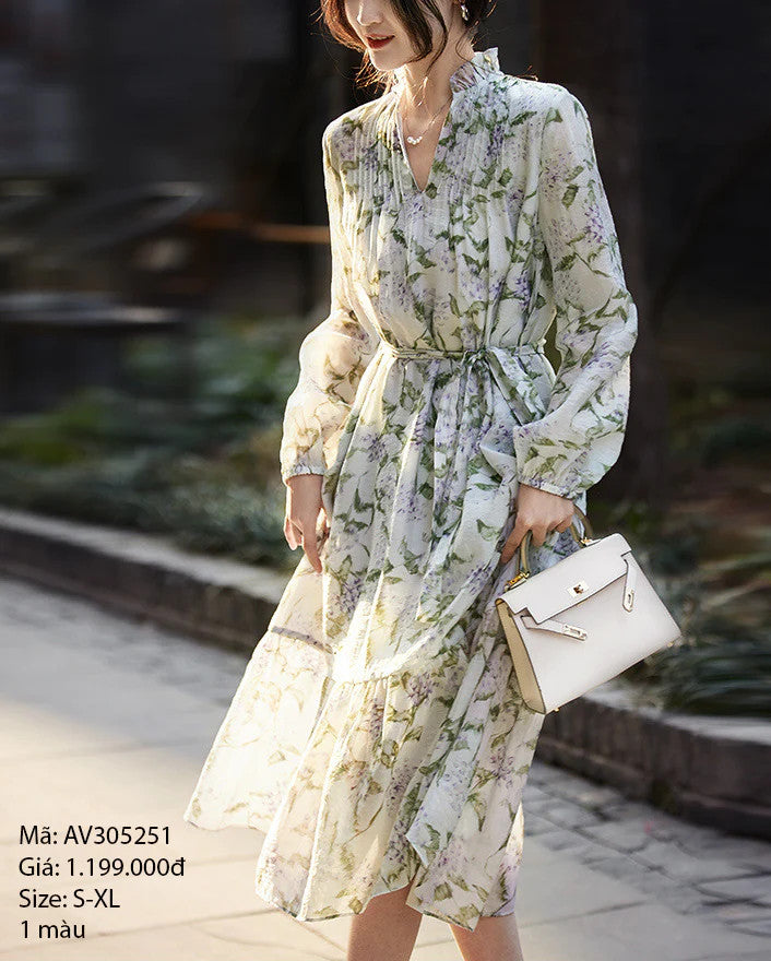 Đầm liền rayon cao cấp họa tiết hoa lá - AV304156