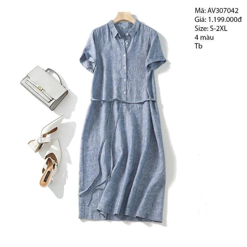 Đầm liền linen ngắn tay cổ đức thắt eo - AV307042