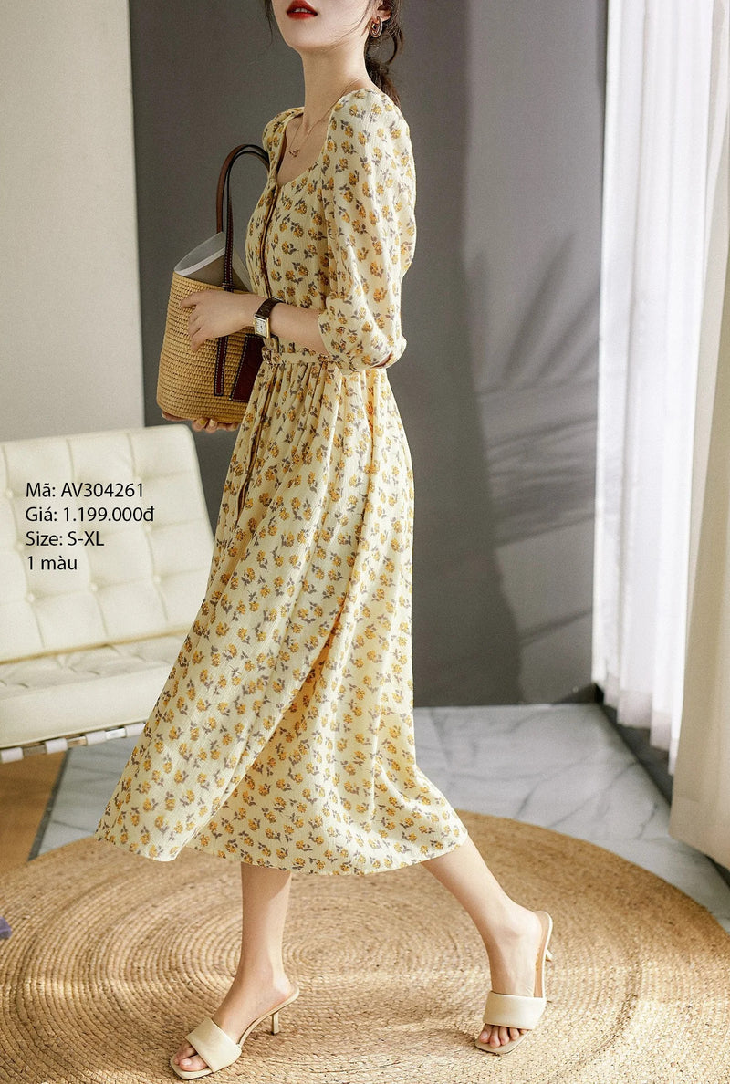 Đầm liền rayon tay lửng cổ V hoa vàng - AV304261