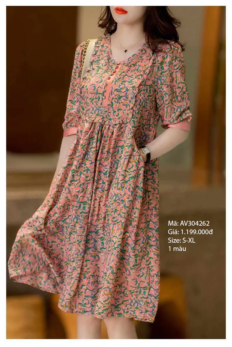 Đầm liền rayon cao cấp họa tiết hoa lá - AV304156