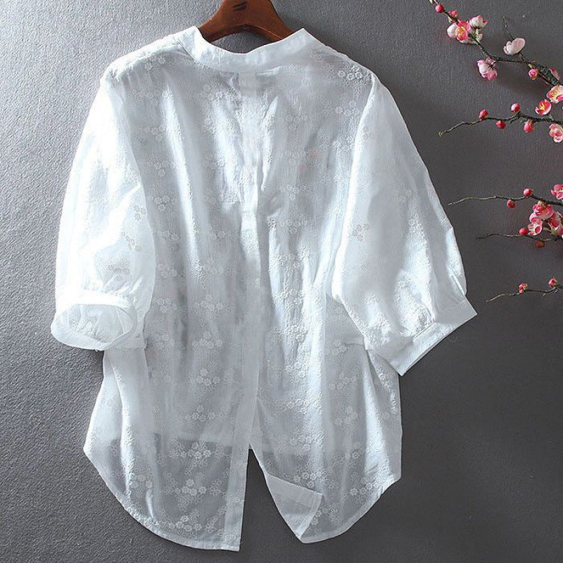 Áo sơ mi cổ V thêu hoa tay lửng - AK0617