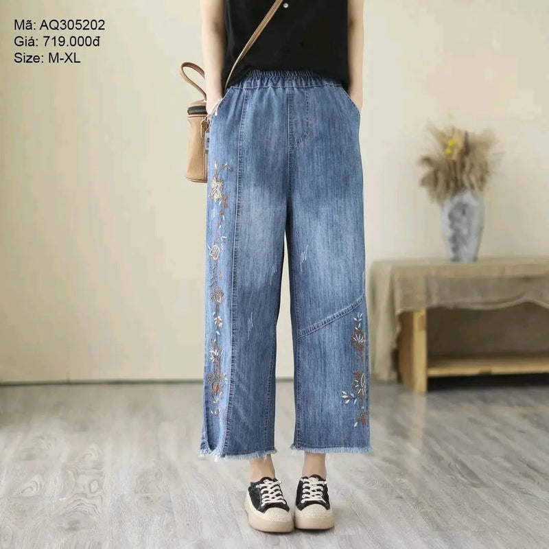 - Quần baggy denim thêu hoa gấu tua rua- AQ305202