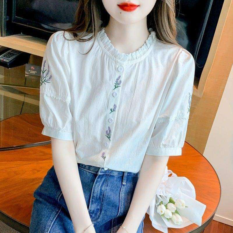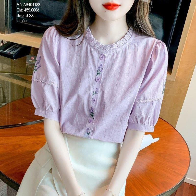 Áo sơ mi cổ xếp ly thêu hoa tím - AS404183